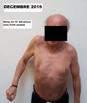Après avoir suivi 6 mois de rééducation en kinésithérapie et sans obtenir d'évolution, il a pris rendez-vous à mon cabinet en décembre 2015. A ce moment-là, il ne peut mobiliser son bras que sur une légère élévation de moins de 10°, avec une forte douleur ainsi que l'épaule en position haute et décentrée (voir photo 1).