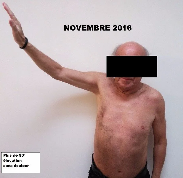 Nous sommes alors maintenant en novembre 2016, il n'a plus de douleur, il peut lever son bras à sa guise, à plus de 120° d'élévation (voir photo 2), ainsi que porter ses courses sans difficultés.